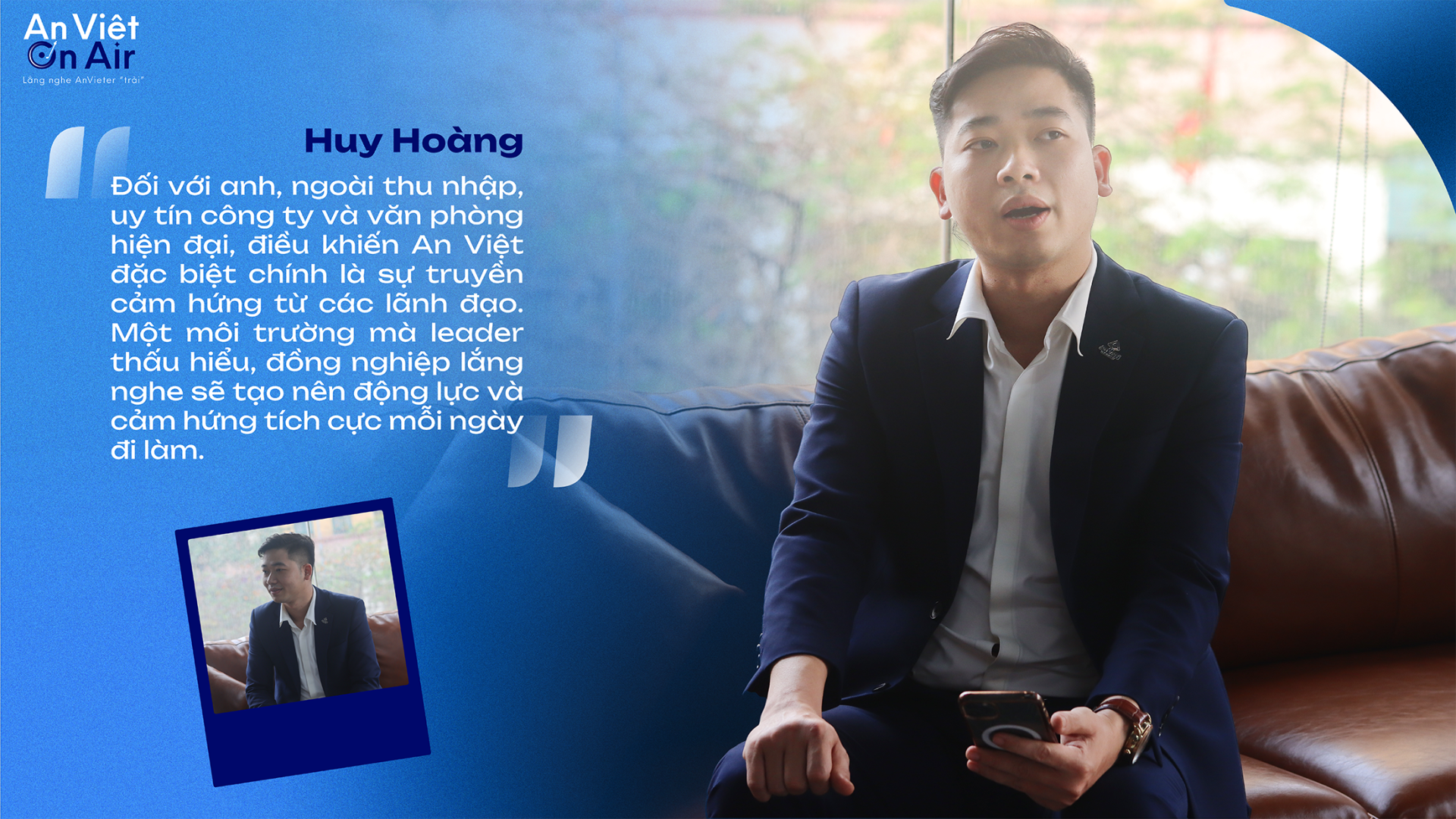 Huy Hoàng: Đối với anh, ngoài thu nhập, uy tín công ty và văn phòng hiện đại, điều khiến An Việt đặc biệt chính là sự truyền cảm hứng từ các lãnh đạo. Một môi trường mà leader thấu hiểu, đồng nghiệp lắng nghe sẽ tạo nên động lực và cảm hứng tích cực mỗi ngày đi làm.